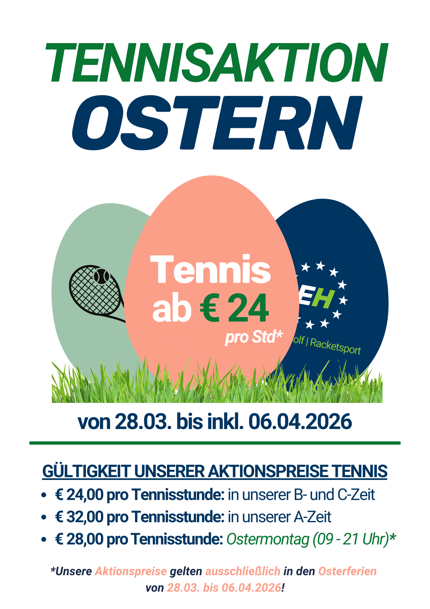 Spiele Tennis in den Ferien zum Aktionspreis! A-Zeit um € 32,00 (statt € 36,00), B- & C-Zeit um € 24,00 (statt € 30,00 bzw. 28,00). Alle Infos inkl leicht geänderter Öffnungszeiten findet ihr im unteren Button. Wir freuen uns auf euren Besuch!