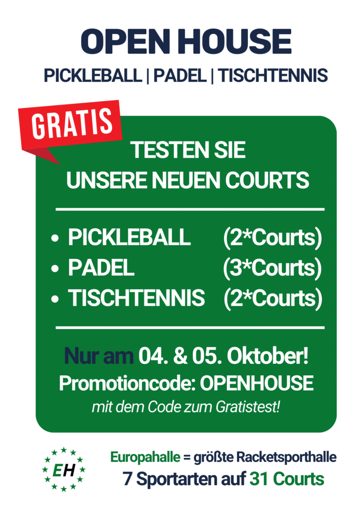 Wir öffnen unsere NEUE Padel, Pickle Ball und Tischtennishalle und möchten Sie zu einem Kennenlerntag einladen! Sichern Sie sich mit dem Code OPENHOUSE Ihren Gratistest!